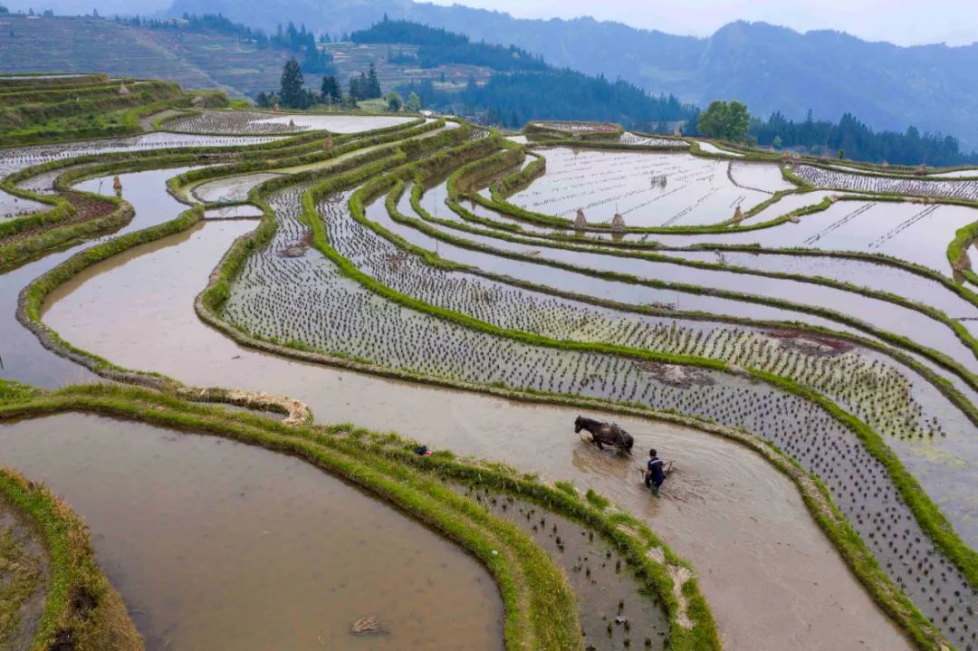 4月10日,村民在贵州省黔东南苗族侗族自治州从江县翠里乡岑丰村梯田里耕作(无人机照片)。图/新华社发 吴德军 摄